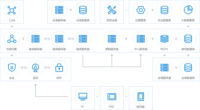 游戏云服务,从构建基础设施到游 戏上线到后期精细化运营,服务服 务涵盖项目整个发展周期。拥有业 内领先的贵阳云数据中心以及国内 优质的BGP多线网络资源,高效稳 定的云服务器、云数据库以及专业 的安全服务,为用户提供贴心全面 的的游戏云解决方案。为用户提供 贴心全面的的游戏云解决方案,筑 造游戏稳定运行的基石。